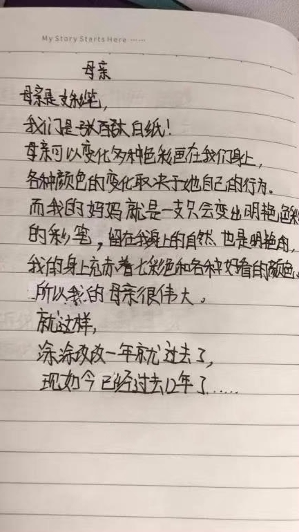 在與(yu) 孩子們(men) 視頻通話時,盛楠收到了一封來自大女兒(er) 親(qin) 筆寫(xie) 的信:“母親(qin) 是支彩筆,我們(men) 是張白紙。母親(qin) 可以變化多種色彩畫在我們(men) 身上,各種顏色的變化取決(jue) 於(yu) 她自己的行為(wei) 。而我的媽媽就是一支隻會(hui) 變出明豔色彩的彩筆,留在我身上的自然也是明豔的,我的身上充斥著七彩色和各種好看的顏色,所以我的母親(qin) 很偉(wei) 大。就這樣,塗塗改改一年就過去了,現如今已經過去12年了……”讀到這裏盛楠濕潤了眼眶。