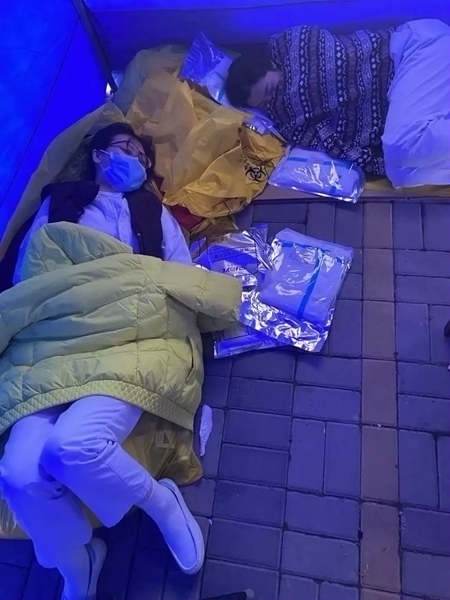 就地休息的醫護人員。