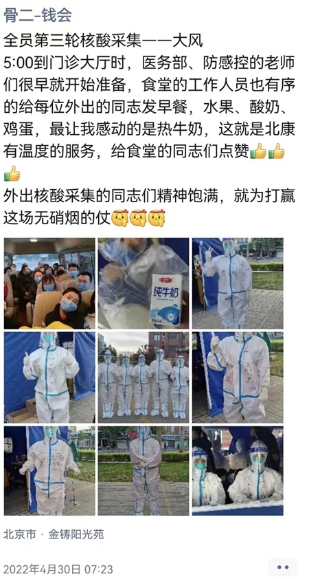 4月30日是五一小長假第一天,晚7點,宣武醫院神經內(nei) 科電生理專(zhuan) 業(ye) 組工作群的消息突然響了,組長黃朝陽發布了一條信息:“5月1日和3日各需5人支援西城核酸采樣任務,請大家積極響應,積極報名!”看到醫院緊急通知,同事們(men) 用無聲、快速地接龍做出了回應,名額很快報滿,很多沒報上的同事還主動要求成為(wei) 候補。