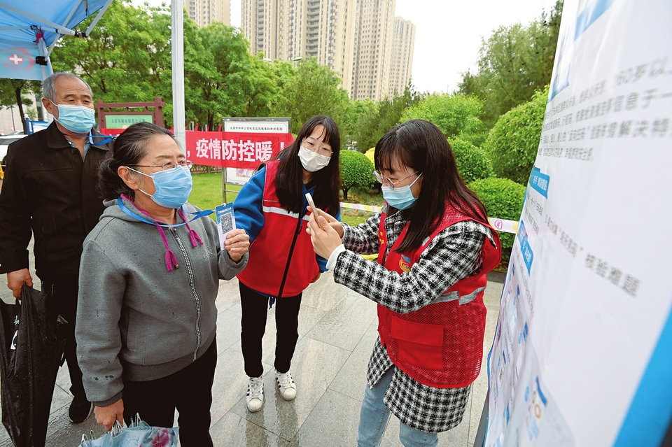 5月12日,太原市和平公園核酸檢測點,老年居民體(ti) 驗“反向掃碼”帶來的便捷。據了解,常態化疫情防控下,為(wei) 保障老年人和未成年人便捷出入公共場所,萬(wan) 柏林區為(wei) 60歲以上老年人及未成年人免費發放集健康碼、行程卡、核酸檢測報告等信息於(yu) 一體(ti) 的愛心碼出行卡,用“反向掃碼”新舉(ju) 措解決(jue) 特殊群體(ti) “亮碼”難題。(記者阮洋攝)