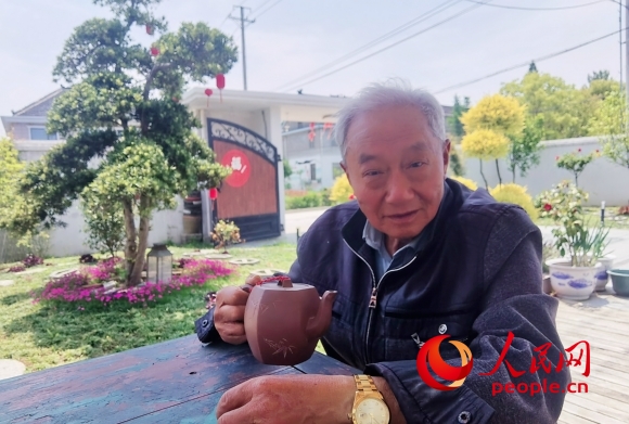 如皋市磨頭鎮十字橋村村民章少華正在自家修剪一新的庭院內(nei) 品茶。人民網記者 王繼亮攝