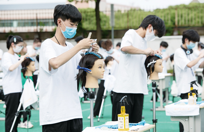 5月17日下午,金華電大(浙江貿易學校)舉(ju) 辦2022年技能文化節,該校美容美發與(yu) 造型、烹飪、建築、數字影像專(zhuan) 業(ye) 400多名學生,在學校操場上進行職業(ye) 技能展示比武,檢驗所學專(zhuan) 業(ye) 水平。(時寬兵)