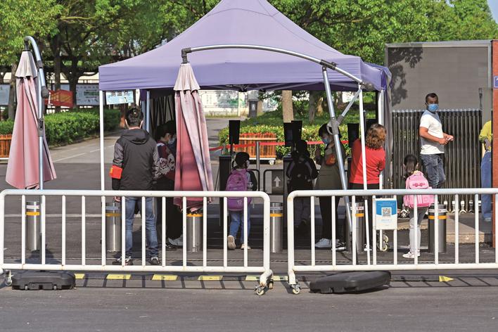 5月16日上午,在嘉興(xing) 嘉善縣一小學門口,同學們(men) 佩戴口罩通過測溫設備有序進入校園,開啟課堂學習(xi) 。據了解,除“三區”外,嘉善縣中小學、幼兒(er) 園均已有序複學複課。(張啟帆)