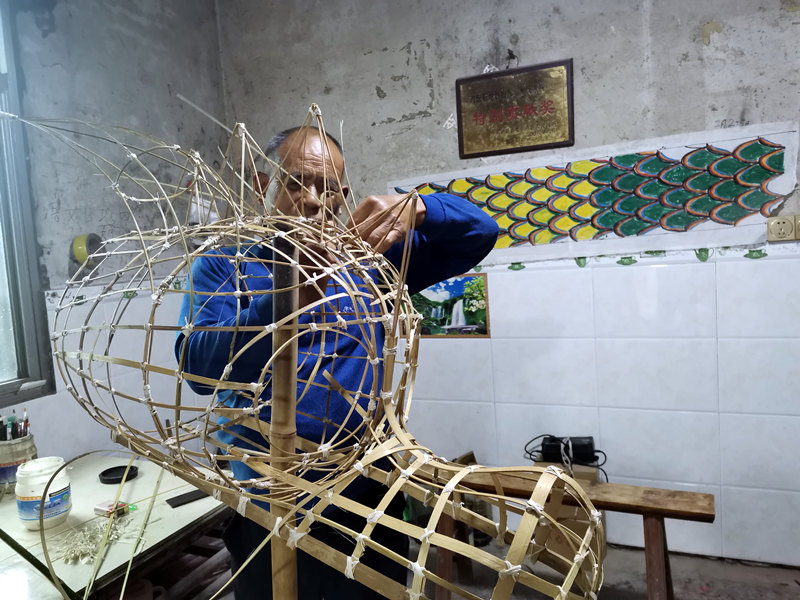 羅德編製雨壇彩龍骨架。曾佐然攝