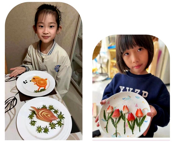 黑芝麻胡同小學學生展示和家長一起製作的水果拚盤