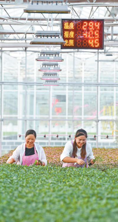 農(nong) 民在貴州省威寧縣的江楠育苗中心管理蔬菜苗,大棚內(nei) 的溫度、濕度、光照可通過人工智能係統調控。