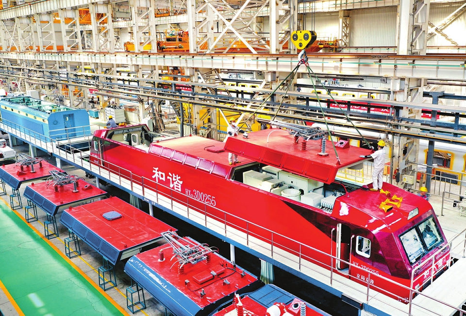 5月20日,在中車太原公司和諧型機車總組裝生產(chan) 線,工人們(men) 正在吊裝電力機車頂蓋。今年以來,中車太原公司克服疫情對生產(chan) 的影響,強化跟蹤工序進度,全麵排查整治安全質量薄弱環節,確保各個(ge) 工序安全高效、工藝質量可靠。目前,公司已實現電力機車檢修產(chan) 品交直流並舉(ju) 的重大跨越。(記者劉通攝)