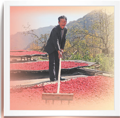 陝西省洋縣金水鎮牛角壩村村民在晾曬山茱萸。