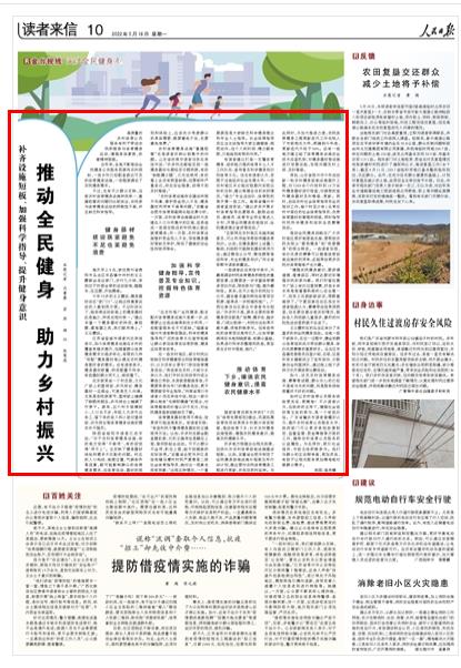 “在農(nong) 村推廣全民健身,配足配齊體(ti) 育健身設施隻是第一步,還需要讓這些設施得到充分利用,一些配套服務也不可或缺。”福建省福州市讀者韓俊強說,科學的健身指導和廣泛的體(ti) 育文化宣傳(chuan) 能夠讓群眾(zhong) 參加體(ti) 育活動更積極、健身運動更有效率。