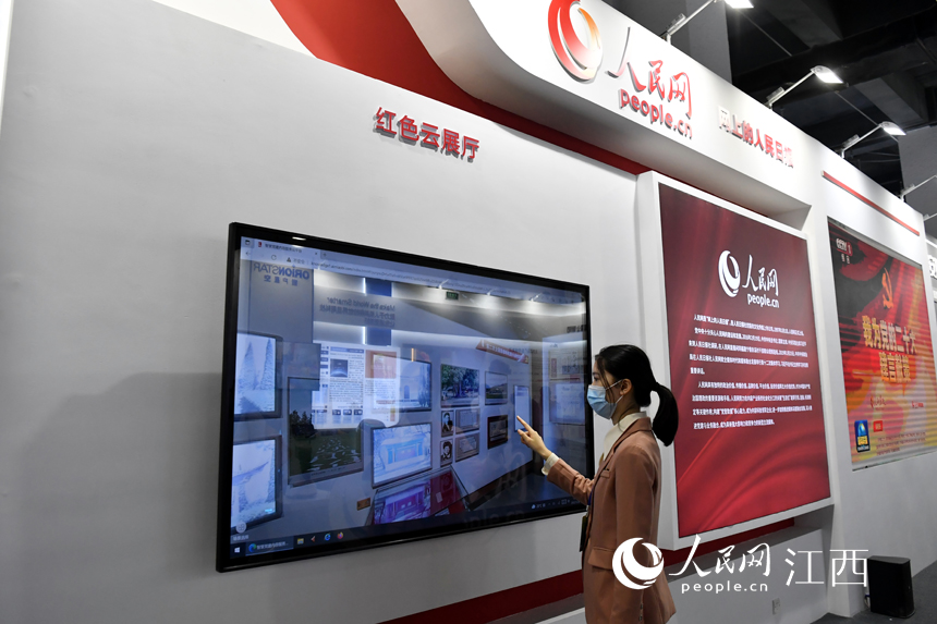 頭部文化企業(ye) 展區的人民網展館內(nei) ,工作人員正在調試紅色雲(yun) 展廳。人民網 時雨攝