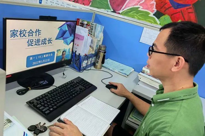 5月22號(捐獻造血幹細胞的前一天),韓熠光在年級辦公室召開線上家長會(hui) 。海口市第二中學供圖