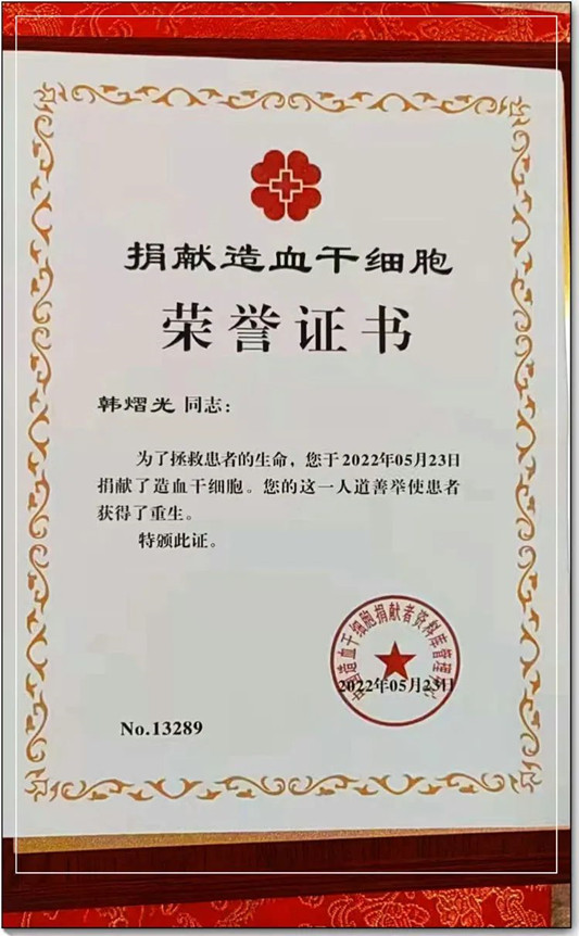 作為(wei) 一名黨(dang) 員,韓熠光一直熱心公益。2001年參與(yu) 無償(chang) 獻血,累計獻血量達1400毫升;2008年,他選擇成為(wei) 一名中華骨髓庫誌願捐獻者;2022年,成為(wei) 了海南省第144例捐獻造血幹細胞的英雄……