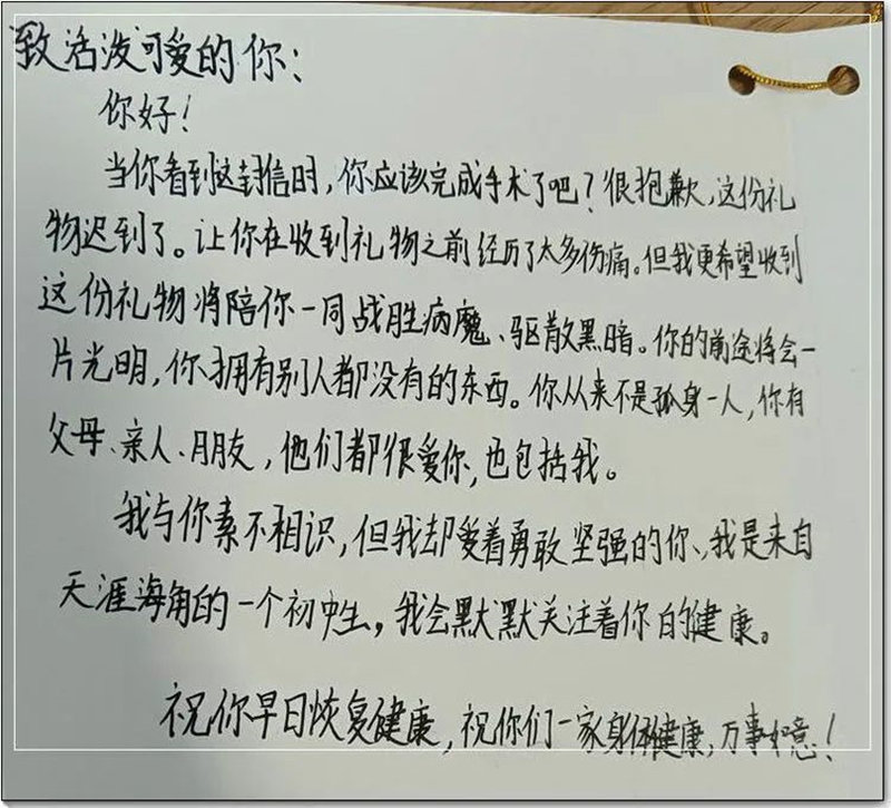 愛是傳(chuan) 遞也是傳(chuan) 承。韓熠光的女兒(er) 在得知父親(qin) 去做捐獻手術時,手寫(xie) 了一封祝福信寄給遠方那位素不相識的“弟弟”,鼓勵他早日戰勝病魔,恢複健康。生命的種子,正伴隨著溫暖椰風,給6歲的小男孩送去生的希望……