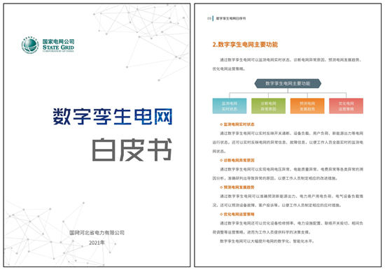 2021年7月,國網河北電科院聯合多家單位編製完成並發布了國內(nei) 電網領域首個(ge) 《數字孿生電網白皮書(shu) 》。白皮書(shu) 歸納總結了雄安數字孿生建設成果,係統闡述了數字孿生電網的主要功能、體(ti) 係架構以及維護管理方式等內(nei) 容,創造性地提出了數字孿生電網的技術架構和技術實現方式,對今後數字孿生技術在電網領域的探索應用具有較強的指導意義(yi) 。