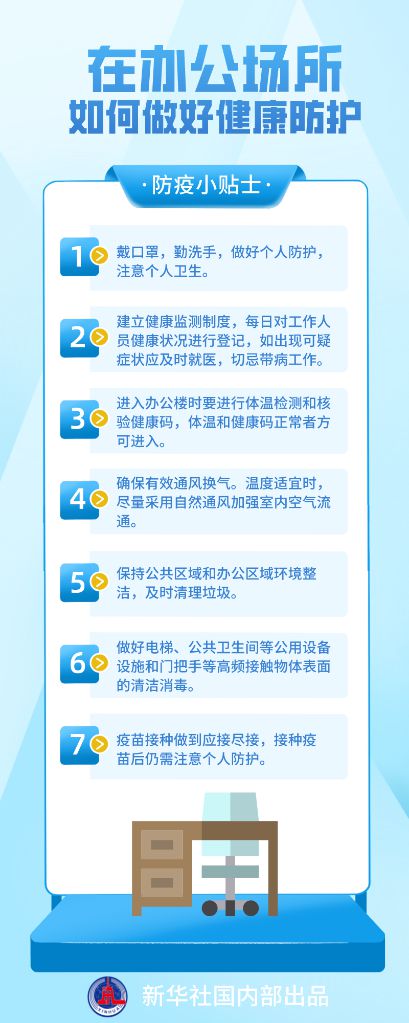 當前,全國日新增本土確診病例和無症狀感染者數量繼續下降,但每日仍有10餘(yu) 個(ge) 省份報告新增本土感染者,疫情防控形勢依然嚴(yan) 峻複雜。國家衛生健康委疾控局副局長、一級巡視員雷正龍提示,要落實重點場所、重點人群、重點單位防控措施。在辦公場所如何做好健康防護?這份來自國家衛生健康委的防護指南請收好。(宋晨、李恒)