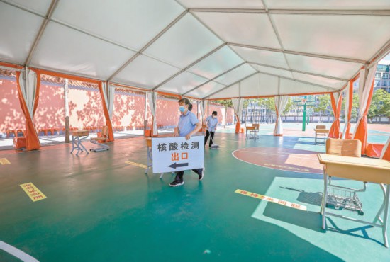 用紅色遮陽棚搭建在操場上的室外休息區,下午考試結束後將變身核酸檢測區。 本報記者 潘之望攝