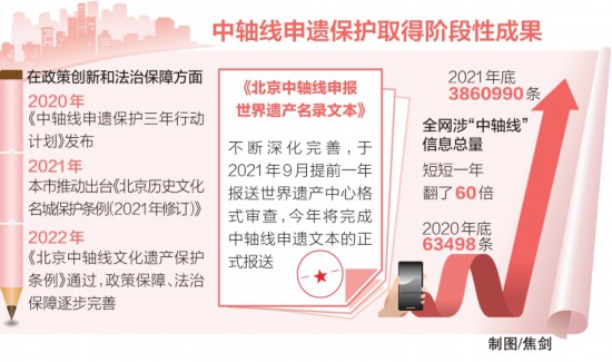 2017年,“積極推進中軸線申遺工作”寫(xie) 入《北京城市總體(ti) 規劃(2016年—2035年)》。同年,北京市推進全國文化中心建設領導小組批準成立了中軸線申遺保護專(zhuan) 項工作組,全麵啟動北京中軸線申遺保護工作……