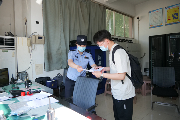 “請他到學校警務室,我們(men) 馬上采集信息。”對講機裏,傳(chuan) 來了讓這位同學安心的聲音。在確認其身份信息後,正在校警務室待命的鹽瀆派出所高考考生服務點民警蔡亞(ya) 華迅速為(wei) 其出具了臨(lin) 時身份證明。從(cong) 報告情況到將臨(lin) 時身份證明送達考生手中,僅(jin) 用時5分鍾。