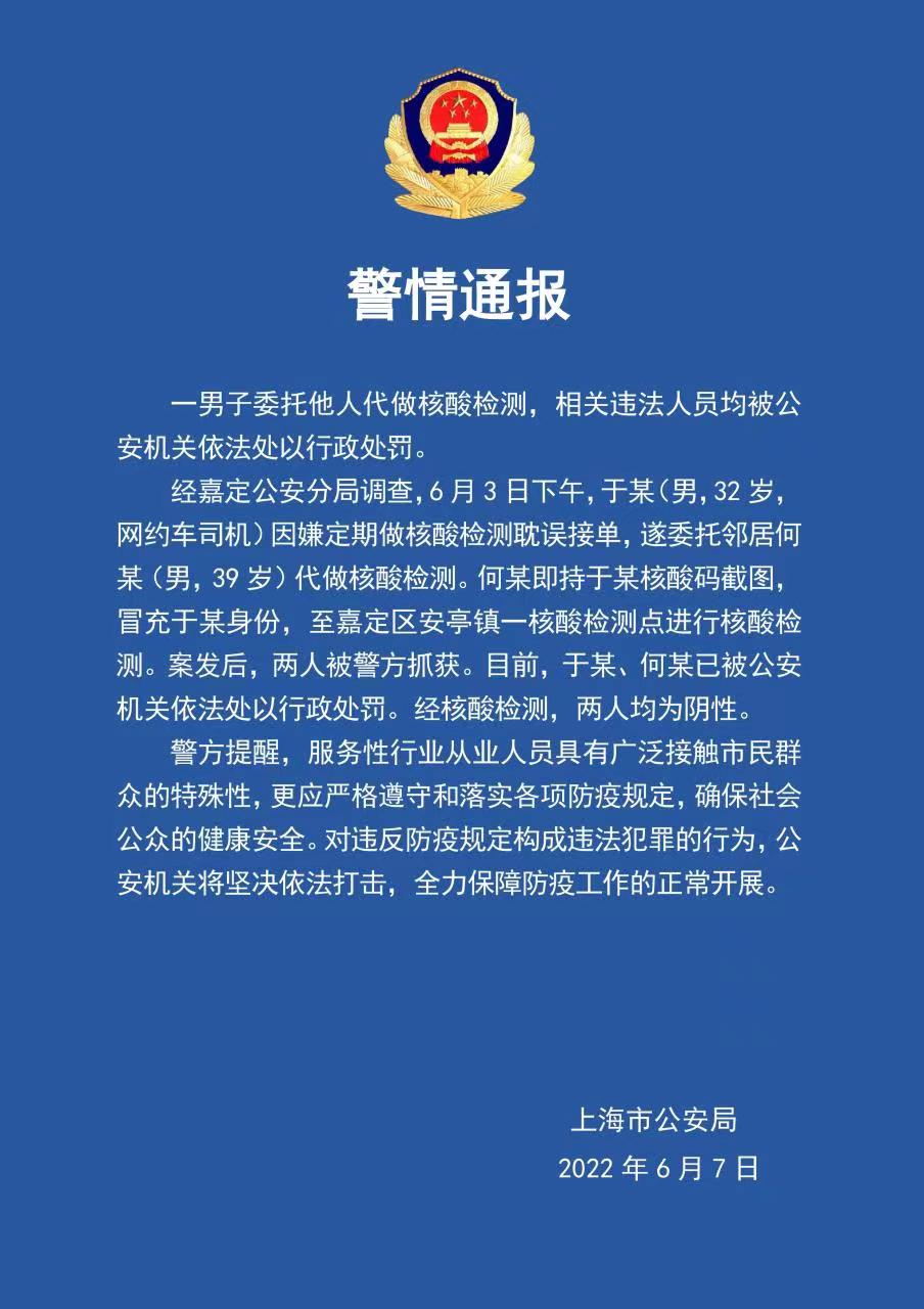 經嘉定公安分局調查,6月3日下午,於(yu) 某(男,32歲,網約車司機)因嫌定期做核酸檢測耽誤接單,遂委托鄰居何某(男,39歲)代做核酸檢測。何某即持於(yu) 某核酸碼截圖,冒充於(yu) 某身份,至嘉定區安亭鎮一核酸檢測點進行核酸檢測。案發後,兩(liang) 人被警方抓獲。目前,於(yu) 某、何某已被公安機關(guan) 依法處以行政處罰。經核酸檢測,兩(liang) 人均為(wei) 陰性。