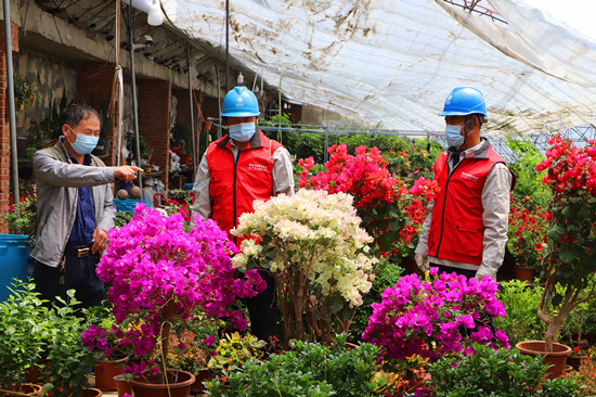 5月25日,冀北承德圍場公司四合永供電所黨(dang) 員服務隊隊員到四合永鎮營字村海岱溝鳳利花卉園藝大棚檢查用電設備。 劉春學攝