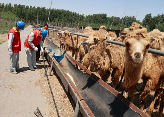 5月31日,國家電網冀北電力唐山“鋼鐵之魂”共產(chan) 黨(dang) 員服務隊隊員來到駱駝專(zhuan) 業(ye) 合作社檢查用電設備。 周宇翔攝