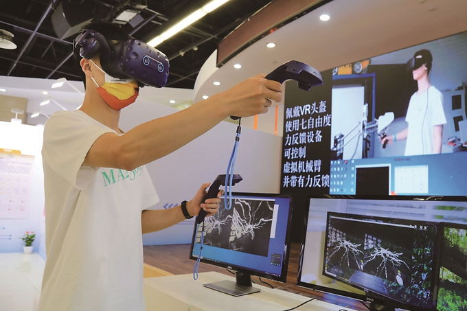五月二十七日,東(dong) 南大學舉(ju) 辦“科學名世、人才報國”教學科研成果展,圖為(wei) 現場展示的VR世界裏操控虛擬機械臂。 本報記者 劉莉 攝