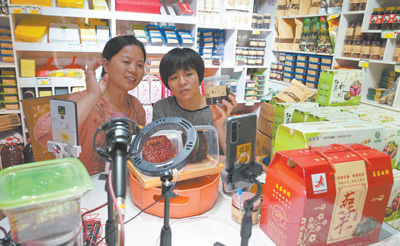 江西鷹潭市餘(yu) 江區大力推廣網絡購物、直播帶貨等消費模式,本地茄子幹、紅薯粉絲(si) 等綠色農(nong) 產(chan) 品搭上網絡快車,走上百姓餐桌。圖為(wei) 餘(yu) 江區益農(nong) 電商運營中心經理於(yu) 小葵(左)在店裏直播帶貨。