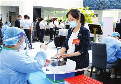 因新冠疫情防控需要,此次黨(dang) 代會(hui) 實行全程閉環管理。“請您先測一下體(ti) 溫。”工作人員熱情地引導著。代表們(men) 佩戴口罩,保持間距,有序完成測溫、驗碼、安檢、流調、核酸檢測,隨後全身心投入到參會(hui) 各項準備工作。
