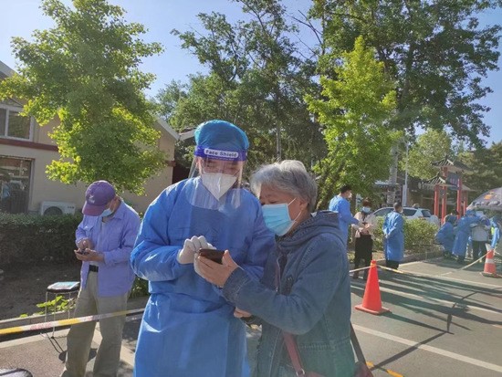 “五一”假期第一天,在通州臨(lin) 河裏街道華遠銘悅南區核酸檢測點,北京金控集團下沉幹部王超拍照、核對、詢問,迅速完成登記工作。老人聽力不佳,他便提高音量、耐心解釋;居民排隊距離過密,他向社區建議調整排隊通道,保證安全。相同的輸入動作、相似的問答話語王超每天要重複近千次。