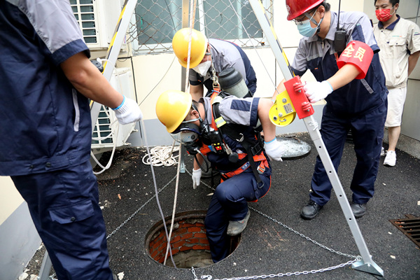 此次演練分為(wei) 前期準備、有限空間規範作業(ye) 及作業(ye) 人員遇險科學施救流程演示三個(ge) 部分。首先,參演人員依次展示了作業(ye) 審批、安全交底、工具檢查、現場安全檢查、封閉作業(ye) 區域並設置警示標誌等作業(ye) 前期準備工作。隨後,對有限空間出入口的有毒有害氣體(ti) 、氧氣濃度進行檢測並進行自然通風或使用機械設備進行強製通風,待監測評估符合作業(ye) 要求後,架設救援用三腳架,參演人員穿戴好有限空間作業(ye) 器具並經檢查合格後,在持續通風並有人員進行安全監護的條件下,下井作業(ye) 。最後,為(wei) 避免因有限空間作業(ye) 發生事故後盲目施救而產(chan) 生連鎖事故,由救援人員展示如何正確穿戴呼吸器等救援防護用品並確保自身安全的前提下下井救援,利用三腳架等設備將受困人員安全救出並脫離危險場所的同時呼叫救援,進行心肺複蘇等規範施救流程。
