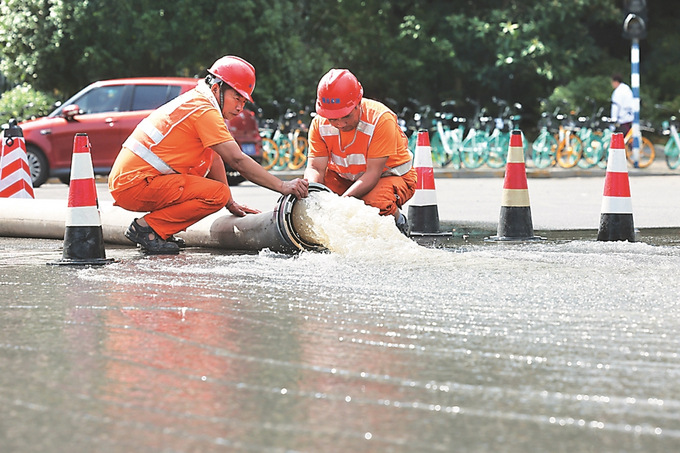 二十四日,南京市鼓樓區水務局工作人員在集賢路操作排水泵車清除積水,恢複道路正常通行。本報記者 陳儼(yan) 攝