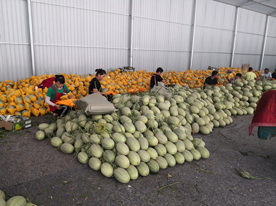 隆堯縣固城鎮小孟村哈密瓜收獲,瓜農(nong) 們(men) 正在挑揀包裝。 任學麗(li) 攝