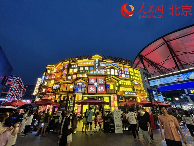 雖是工作日傍晚,剛過6點,華熙LIVE·五棵鬆的街區上人已熙熙攘攘,要想嚐嚐網紅餐廳,已經需要拿號等位了。順著香味一路走,一家裝潢極具重慶吊腳樓特色的火鍋店十分引人注目,成了夜景打卡地,飄香的麻辣味也勾起了不少食客的“饞蟲”。