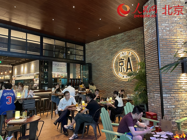 除了火鍋店,一家名為(wei) “京A Taproom”的美式精釀啤酒餐吧也熱鬧十足。美式工業(ye) 風的裝潢極具格調,炸雞配啤酒的組合也頗有人氣。“這裏的氛圍我很喜歡,小吃和啤酒也很對我的胃口,來這裏能夠忘掉那些煩惱和壓力。”李女士在工作了一天之後,邀約了朋友一起來這家餐吧放鬆心情。