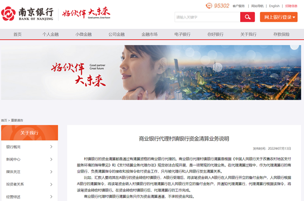 南京銀行回應代理村鎮銀行清算業務:不承擔資金風險