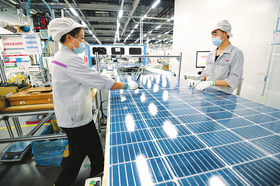 7月15日,大同隆基光伏科技有限公司光伏麵板生產(chan) 線上,工人們(men) 正在對產(chan) 品進行最後檢測。該公司規劃布局了3條自動化生產(chan) 線,引入目前行業(ye) 內(nei) 先進的生產(chan) 設備和技術工藝。全部建成投產(chan) 後,預計年產(chan) 值約30億(yi) 元。(記者李兆民攝)