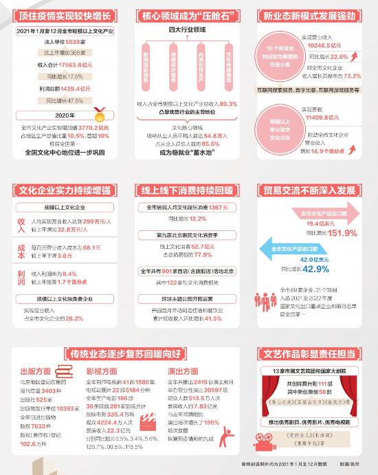 2021年是“十四五”開局之年,北京文化產(chan) 業(ye) 發展圍繞落實習(xi) 近平總書(shu) 記關(guan) 於(yu) 文化建設的重要論述,服務國家文化發展戰略,立足推進全國文化中心建設,以高質量發展為(wei) 主線,在疫情防控常態化形勢下,積極主動應變求新、穩中求進,實現了“十四五”時期的良好開局。