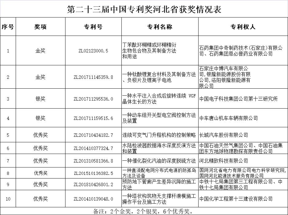 近日,國家知識產(chan) 權局公布關(guan) 於(yu) 第二十三屆中國專(zhuan) 利獎授獎的決(jue) 定,河北省10項專(zhuan) 利獲中國專(zhuan) 利獎。其中,金獎、銀獎各2項,優(you) 秀獎6項。河北省企業(ye) 連續三年獲得中國專(zhuan) 利獎金獎,金獎銀獎獲獎數量再創曆史新高。