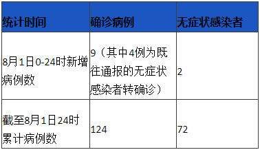 人民網成都8月2日電 (王波)據成都市衛健委消息,8月1日0-24時,“07·20”疫情新增本土確診病例9例(其中4例為(wei) 既往通報的無症狀感染者轉確診),新增本土無症狀感染者2例。截至8月1日24時,本起疫情累計報告本土確診病例124例,本土無症狀感染者72例。