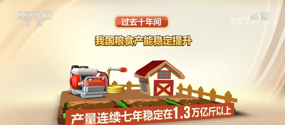 過去十年間,我國糧食產(chan) 能穩定提升,產(chan) 量連續七年穩定在1.3萬(wan) 億(yi) 斤以上,十年再上一個(ge) 千億(yi) 斤新台階。人均糧食產(chan) 量達到483.5公斤,高於(yu) 國際公認的400公斤糧食安全線,做到了穀物基本自給、口糧絕對安全。