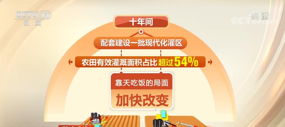 十年間,農(nong) 業(ye) 基礎設施明顯改善,累計建成9億(yi) 畝(mu) 高標準農(nong) 田,配套建設一批現代化灌區,農(nong) 田有效灌溉麵積占比超過54%,靠天吃飯的局麵加快改變。