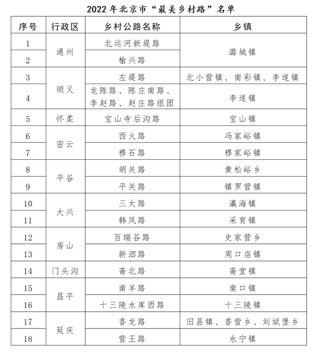 據了解,今年是美麗(li) 鄉(xiang) 村路創建開展的第三年,在總結以往創建經驗的基礎上,北京市交通部門修訂了美麗(li) 鄉(xiang) 村路創建的評分標準,明確創建主題,新增“路長製”落實情況、慢行係統建設、服務特色小鎮和美麗(li) 鄉(xiang) 村建設等評分項。今年全市10個(ge) 郊區共創建71條313公裏美麗(li) 鄉(xiang) 村路,在此基礎上經過進一步篩選,最終評出18條共計193公裏“最美鄉(xiang) 村路”。其中,通州、順義(yi) 、密雲(yun) 、平穀、大興(xing) 、房山、昌平、延慶區各2條,懷柔、門頭溝區各1條。