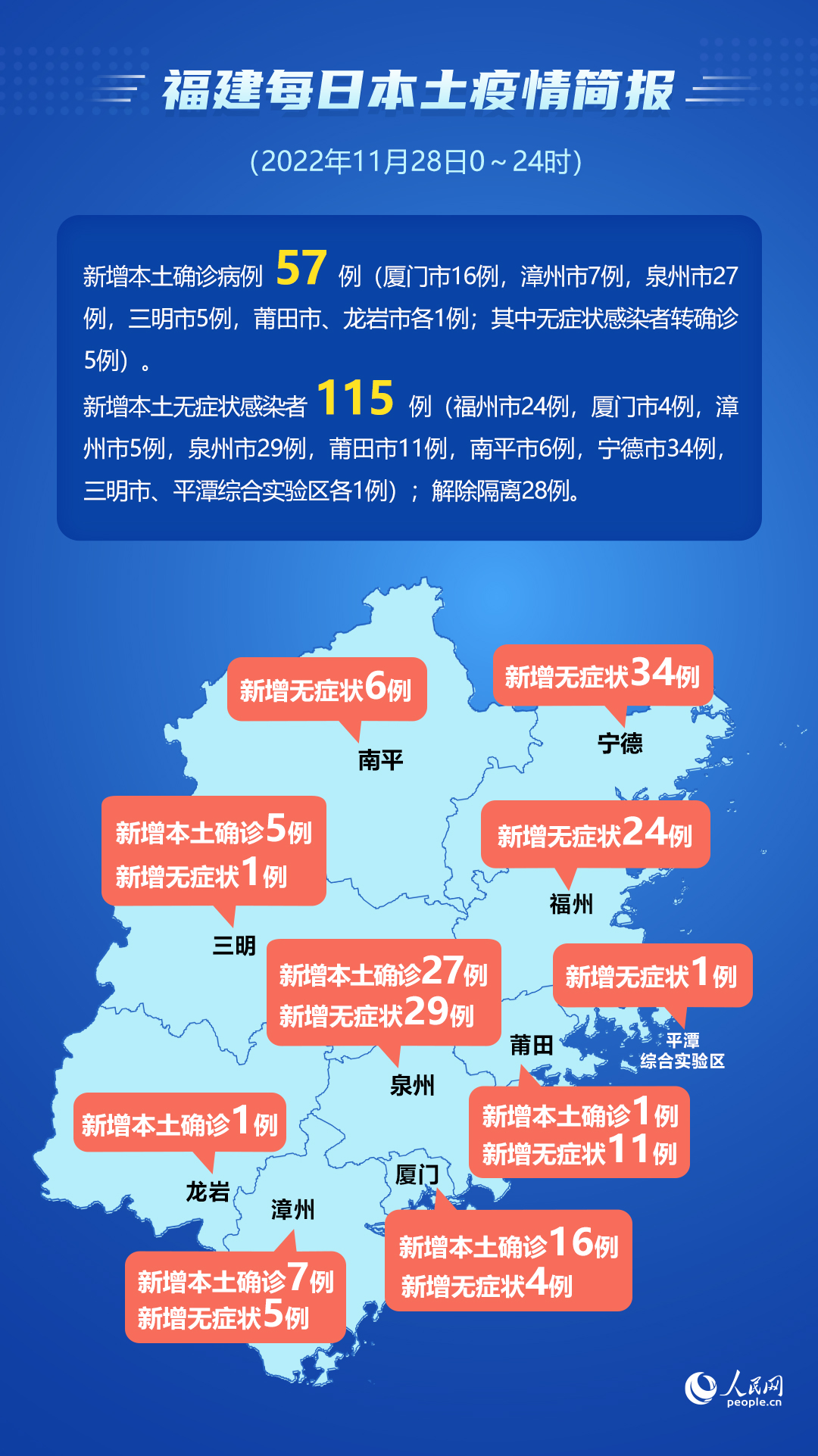 人民網福州11月29日電 (江葦杭、陳永整)據福建省衛健委網站消息,11月28日0-24時,福建省報告新增本土確診病例新增本土確診病例57例(廈門市16例,漳州市7例,泉州市27例,三明市5例,莆田市、龍岩市各1例;其中無症狀感染者轉確診5例)。當日報告新增本土無症狀感染者115例(福州市24例,廈門市4例,漳州市5例,泉州市29例,莆田市11例,南平市6例,寧德市34例,三明市、平潭綜合實驗區各1例);解除隔離28例。全省本土確診病例目前住院365例,無死亡病例;現有本土無症狀感染者尚在接受集中隔離醫學觀察623例。