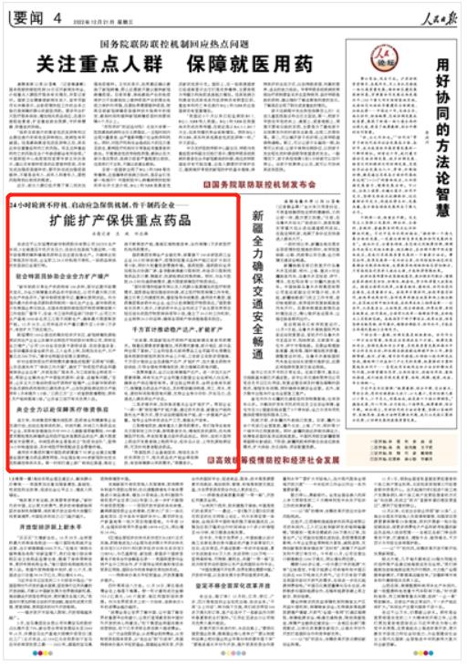 針對當前防疫治療藥物需求激增造成短期“買(mai) 藥難”問題,山東(dong) 迅速發布了“保供工作方案”,確定了“防疫醫療藥品和器械保供企業(ye) 名單”,並派駐駐廠服務員,與(yu) 工信部駐企特派員一起,幫助企業(ye) 解決(jue) 生產(chan) 中麵臨(lin) 的原料、設備、運輸等問題。“目前,山東(dong) 正大力推動防疫治療藥物擴能增產(chan) ,山東(dong) 新華製藥的布洛芬原料藥和製劑已滿負荷生產(chan) ,山東(dong) 抗原檢測試劑日產(chan) 能明年1月將提升1.5倍,‘三藥三方’之一的宣肺敗毒顆粒,明年1月產(chan) 能將提高1倍。”山東(dong) 省工信廳有關(guan) 負責人說。