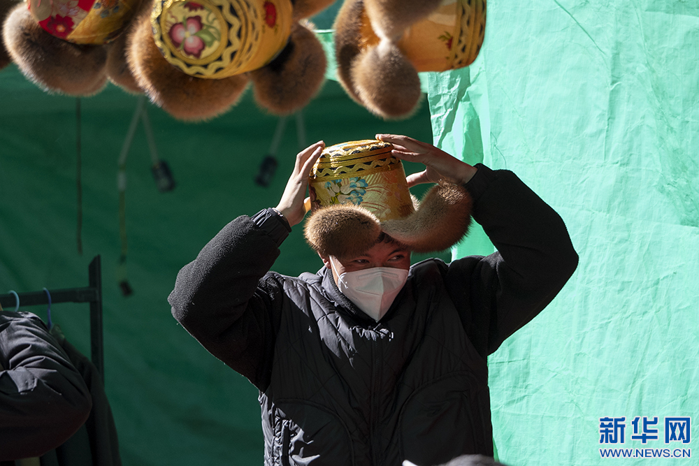 12月3日,顧客在物交會(hui) 上試戴傳(chuan) 統金絲(si) 藏帽。新華網 旦增努布 攝