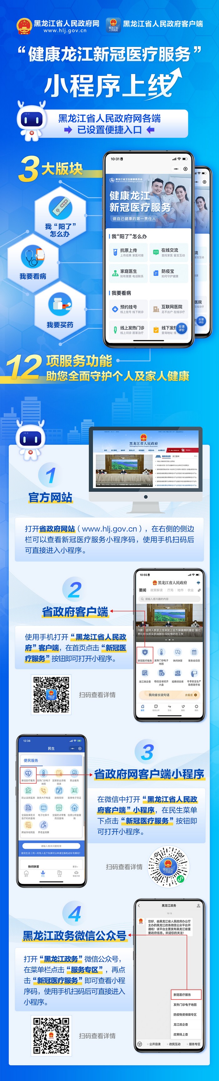 “健康龍江新冠醫療服務”小程序已經正式上線,為(wei) 了讓全省人民更加便捷地找到小程序,及時獲取服務,黑龍江省人民政府網站、官方客戶端、小程序、官方微信公眾(zhong) 號等平台已全麵開通“健康龍江新冠醫療服務”便捷入口。3大板塊12項服務功能助您全麵守護個(ge) 人及家人健康。