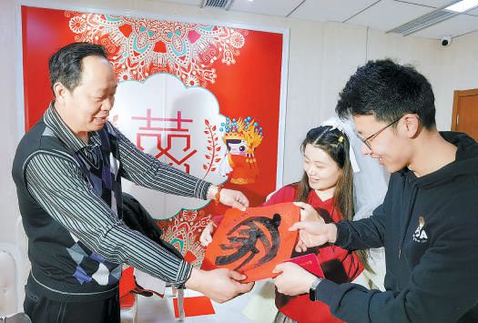昨天,在石景山區婚姻登記處,新人收到飽含祝福的書(shu) 法作品。 本報記者 吳鏑攝