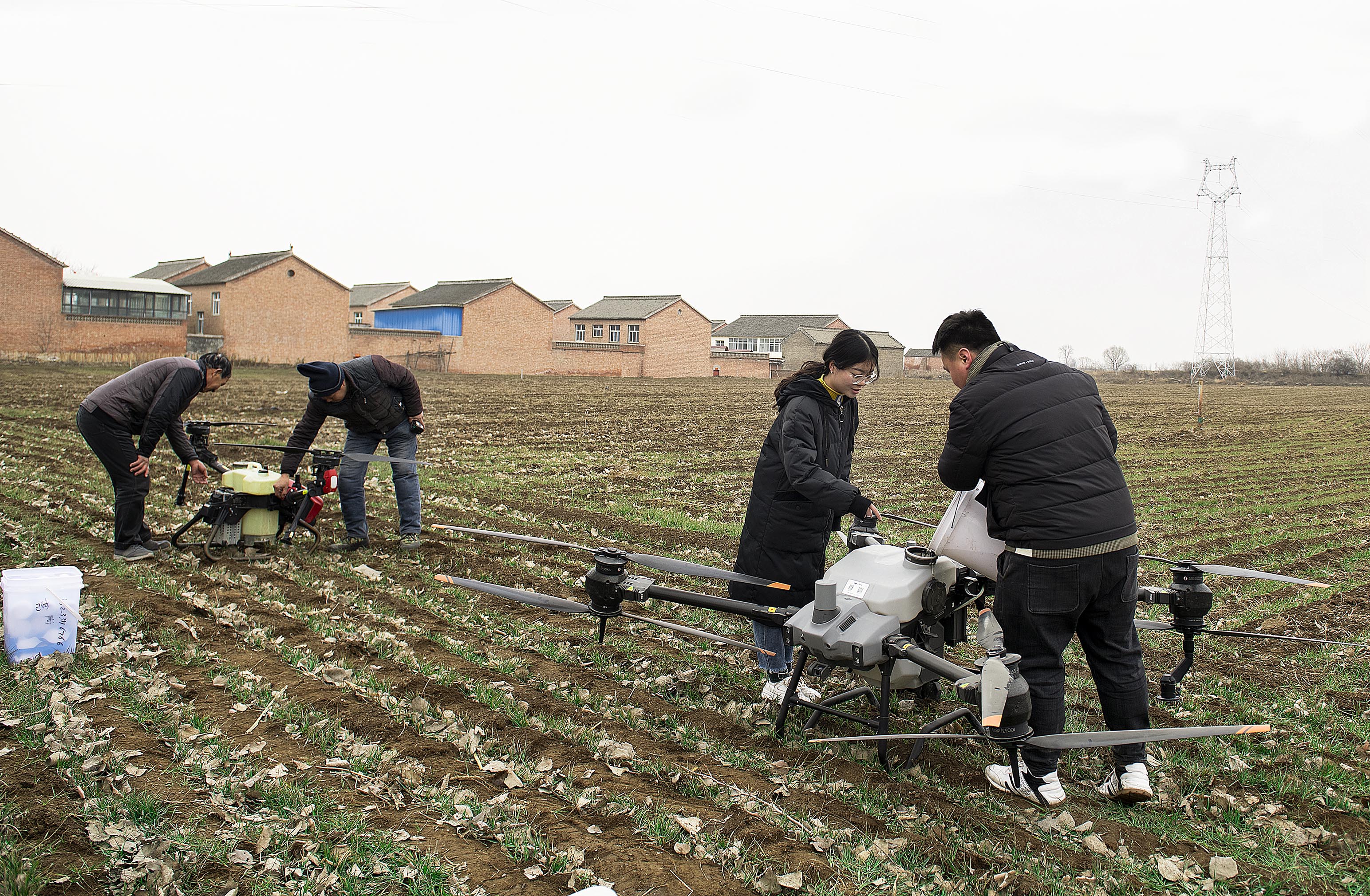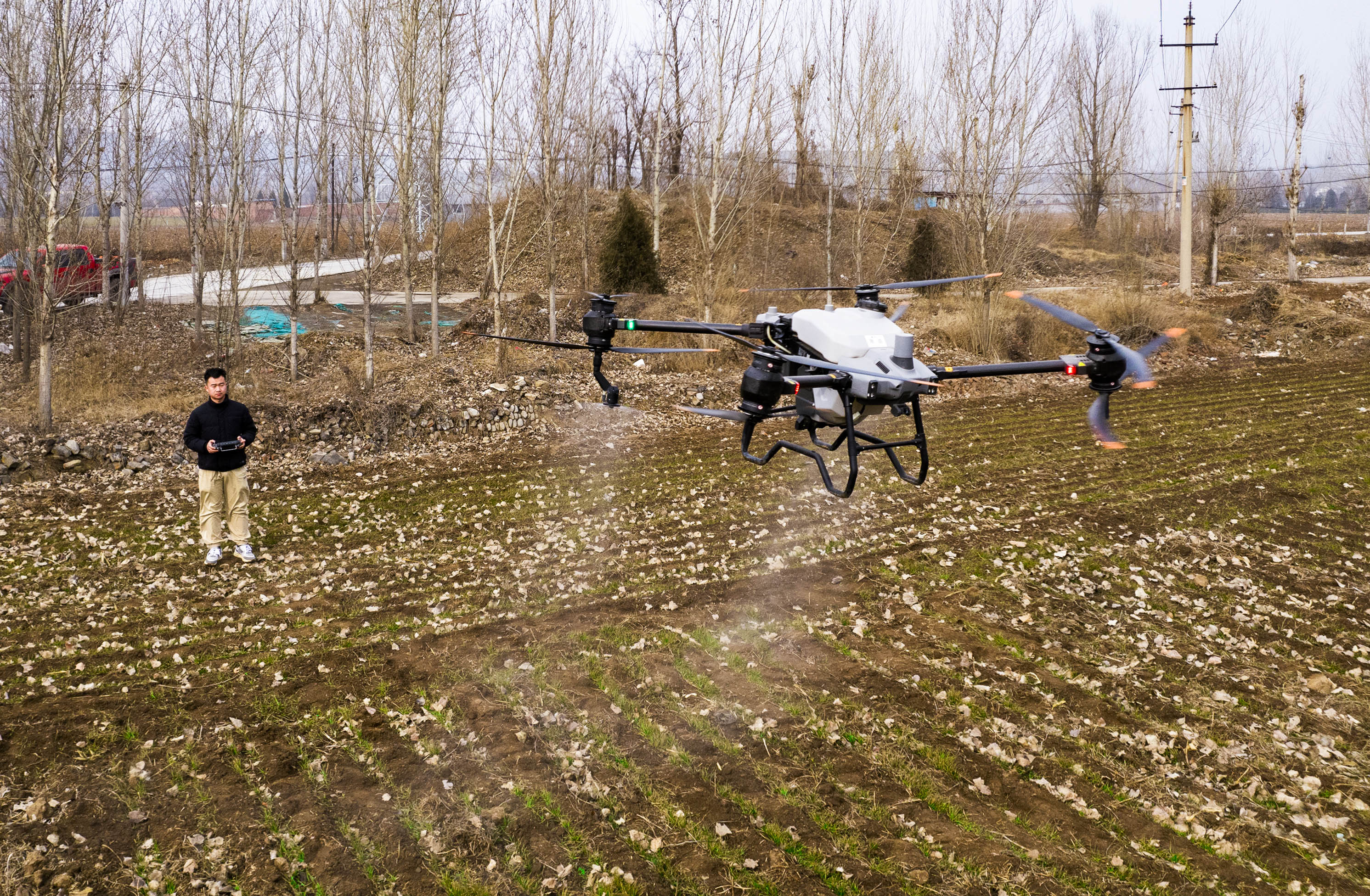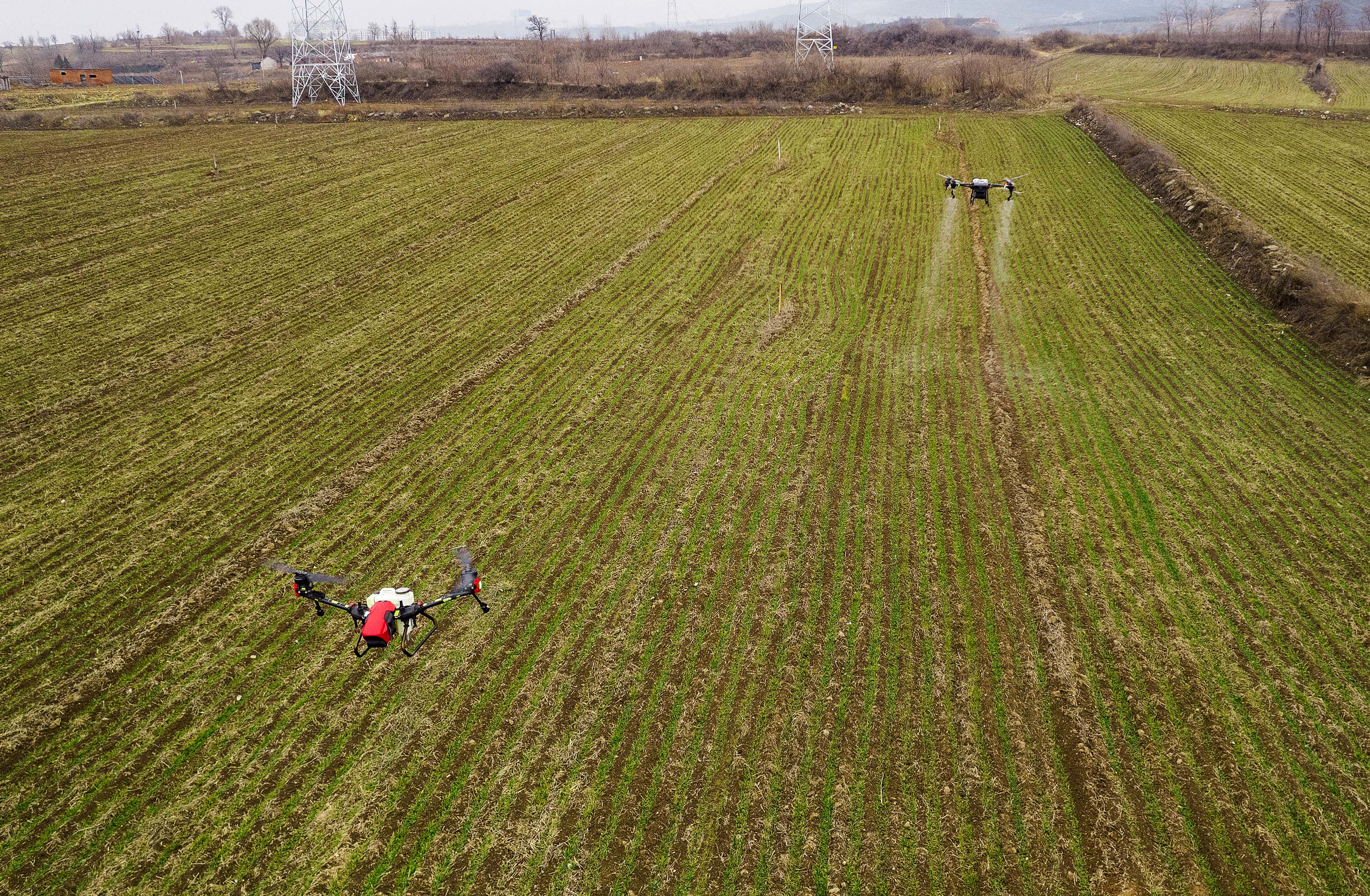 2月15日,在晉城市城區南村鎮,操作員正熟練地遙控農(nong) 業(ye) 專(zhuan) 用無人機給麥田播撒肥料,大大提高了工作效率。