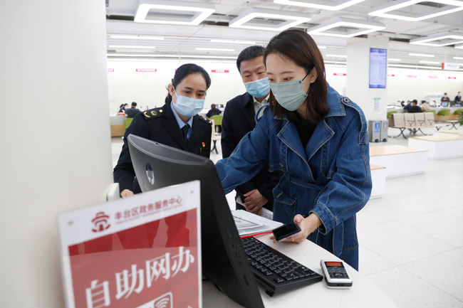 3月23日,個(ge) 體(ti) 工商戶劉鵬琨女士在豐(feng) 台區政務服務中心領取到了全國首張個(ge) 體(ti) 網店轉實體(ti) 店的營業(ye) 執照。渠忠濤攝