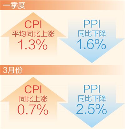 本報北京4月11日電 (記者劉誌強)國家統計局11日發布數據顯示:3月份,CPI(居民消費價(jia) 格指數)同比上漲0.7%,漲幅比上月回落0.3個(ge) 百分點;PPI(工業(ye) 生產(chan) 者出廠價(jia) 格指數)同比下降2.5%,降幅比上月擴大1.1個(ge) 百分點。從(cong) 一季度看,CPI平均同比上漲1.3%,PPI同比下降1.6%。一季度CPI持續運行在合理區間,物價(jia) 保持平穩運行,為(wei) 全年物價(jia) 穩定奠定了堅實基礎。